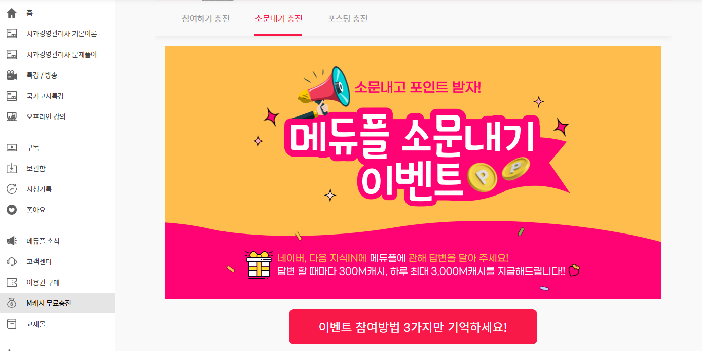 메듀플은 M캐쉬 무료충전을 통해 수강료 부담을 덜 수 있는게 참 좋은 것 같습니다. M캐쉬는 현금과 동일하게 1:1 비율로 사용이 가능하기에 많이 유용하더라고요. 이벤트에 참여하는 참여하기 방식과 지식인 댓글 방식인 소문내기 방식, 그리고 블로그나 카페의 포스팅을 통한 참여인 포스팅 충전 방식이 있습니다.