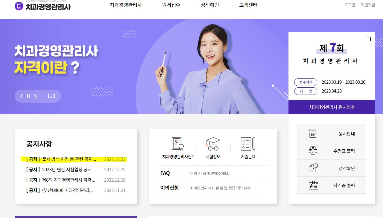 치과경영관리사 자격위원회 공지가 뜬것을 최근에 확인했습니다. 주요 내용은 2023년도 부터 시행되는 시험부터 기존 과목당 40문제에 서술형 또는 약술형 5문제였던 총 45문제가, 객관식 40문제로 변경된다는 이야기입니다. 또한 시험 시간도 기존 4교지에서 2과목을 1교시씩으로 묶어서 2교시로 종료되네요. 다만 1교시당 시험시간이 80분으로 늘어나긴 했습니다.
