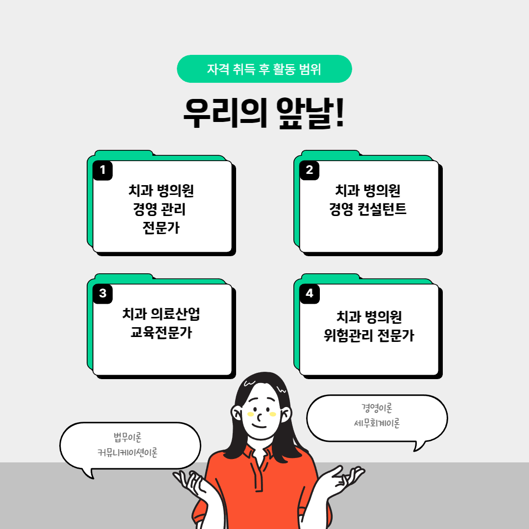 올해의 치과 의료시장의 경쟁도 다소 치열할 것으로 생각됩니다. 치열한 만큼 사건과 사고가 끊이질 않을 것으로 보이는데요, 경영 전반에 있어서 위험관리가 가능한 치과경영관리사(치경사)의 취득으로 나 자신의 전문 역량을 키우고, 더 넓은 세상으로 진출하는건 어떨까 싶네요. 오늘의 나는 내일의 나를 만들어 갑니다. 모두 열공하시죠!