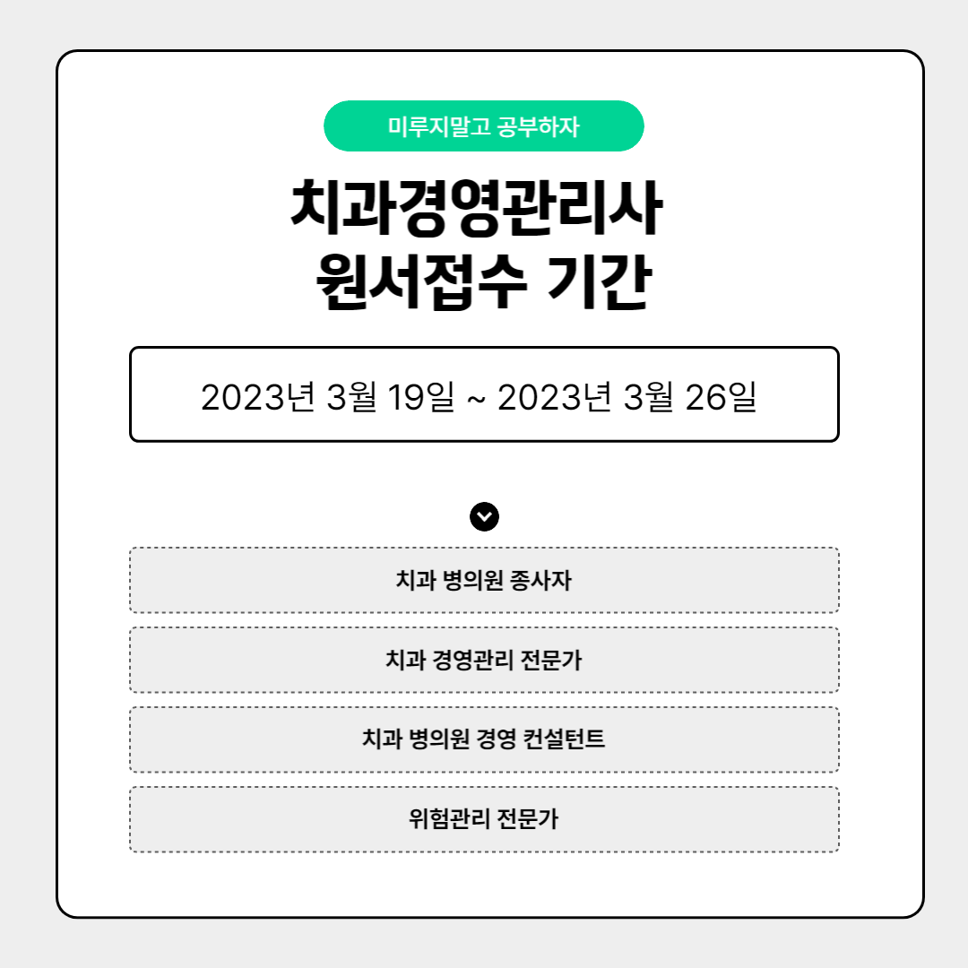 올해의 치과 의료시장의 경쟁도 다소 치열할 것으로 생각됩니다. 치열한 만큼 사건과 사고가 끊이질 않을 것으로 보이는데요, 경영 전반에 있어서 위험관리가 가능한 치과경영관리사(치경사)의 취득으로 나 자신의 전문 역량을 키우고, 더 넓은 세상으로 진출하는건 어떨까 싶네요. 오늘의 나는 내일의 나를 만들어 갑니다. 모두 열공하시죠!