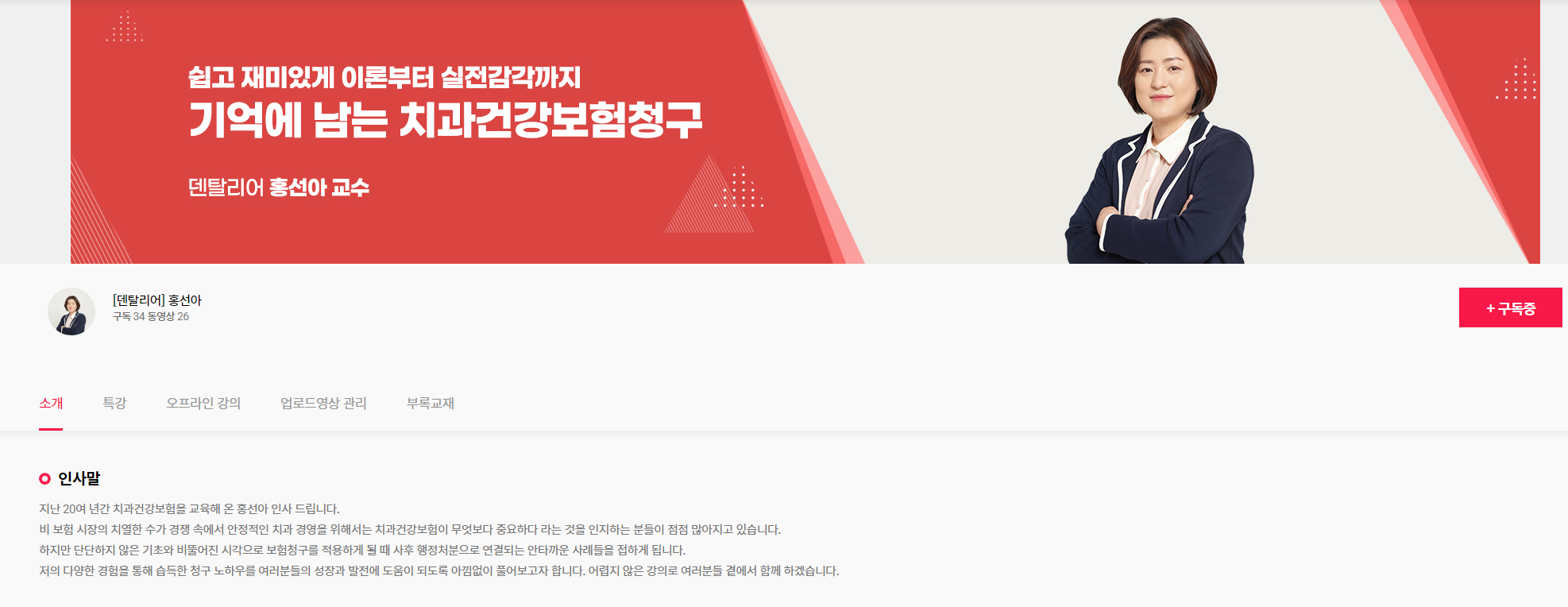 치과 시장은 치열한 수가 경쟁 속에 안정적인 경영이 이루어져야 하므로 치과건강보험은 그 무엇보다도 중요한 부분이에요. 자칫 잘못된 생각으로 인한 청구는 행정처분으로 이어지기도 하므로 전문가의 교육을 받은게 필수인것 같습니다. 덴탈리어 홍선아 교수님은 대한치과보험학회 학술이사, 치과위생사회 회장, 대학교 치위생과 겸임교수 등의 확실한 커리어를 기반으로 실무적으로 꼭 필요한 핵심 내용만 추려서 여러분의 이해를 돕고 계십니다.