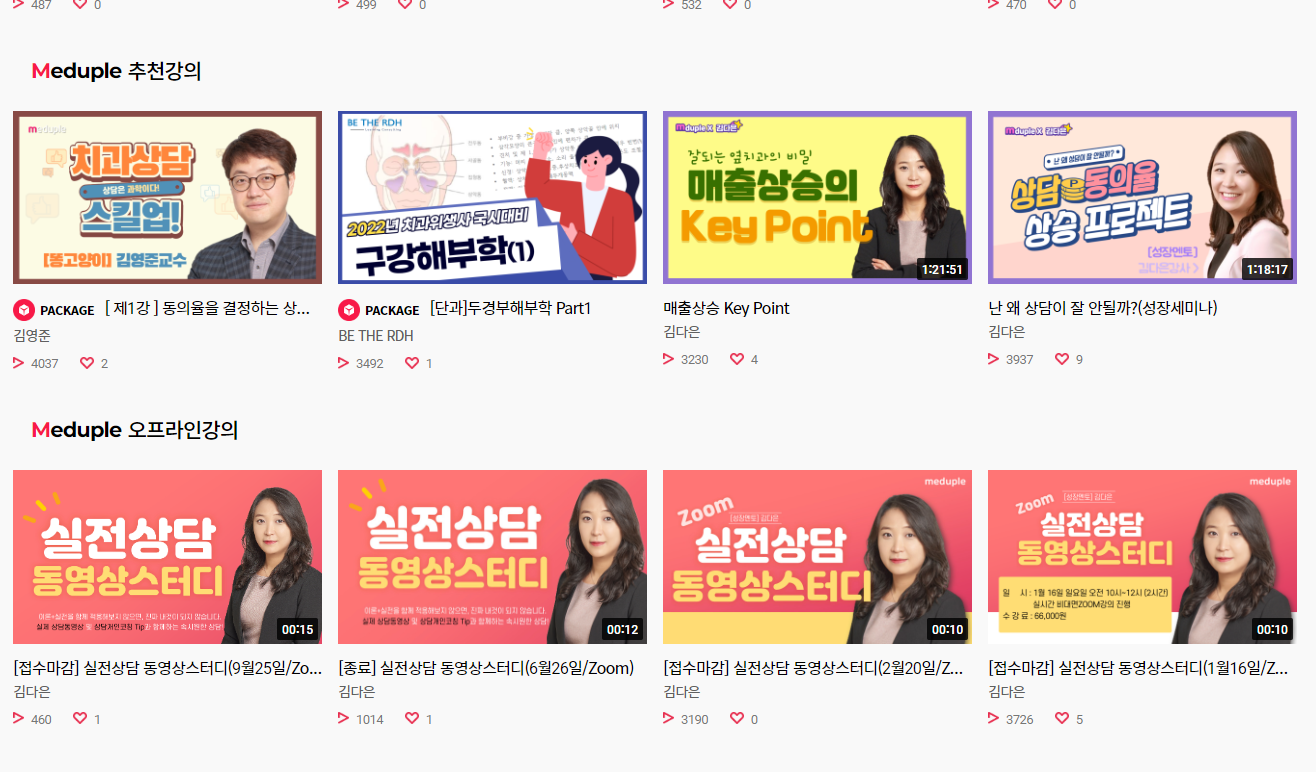 특히 메듀플은 치과경영관리사 강의도 개강되어있기에 치과 의료산업 시장에 조금 더 특화되어있는 것 같습니다. 물론 환자 상담을 통한 매출증진, 고객응대 CS교육, 노무교육, 사업분석 등은 어느 업종이든 상관없이 수강할 수 있는 좋은 교육 콘텐츠인 것 같습니다. 하나 하나씩 전부 수강하면 상당히 좋은 스킬을 연마할 수 있을 것 같아요.