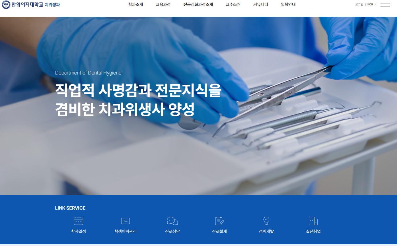 김해대학교 치위생과는 2021년도에 처음 신입생을 받기 시작하였습니다. 치위생과는 구강 건강의 증인 방법을 교육하는 학과로써, 보건의료인국가시험원에서 실시하는 치과위생사 자격 취득을 목표로 하고 있으며, 졸업 후에는 치과 병의원은 불론 종합병원, 대학병원, 사기업, 보건소, 학교, 건강보험기관 등으로 취업이 가능합니다.