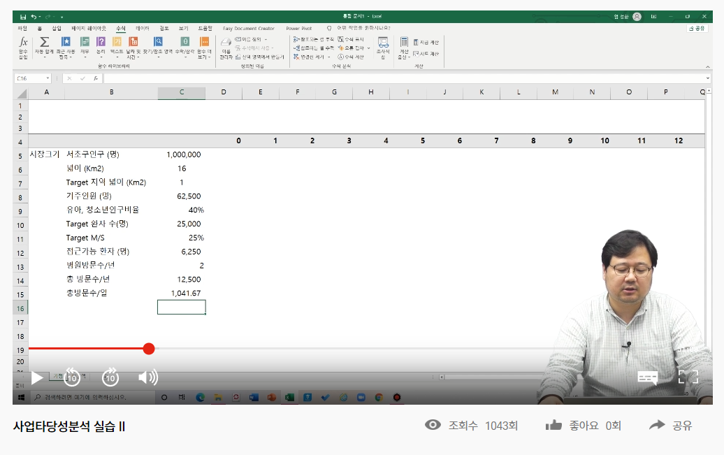 병의원 사업타당성 분석 특강 교육은 이론 1시간과 실습 2시간 과정으로 이루어져 있습니다. 실습은 사업타당성 분석을 실제로 해볼 수 있는 사례를 바탕으로 엑셀 화면에서 진행이 되는데요, 실습강의가 정말 많은 도움이 되는것 같습니다. 테블릿 강의라고 하나요? 화면 전체가 실습화면이라 보기에 좋더라고요.