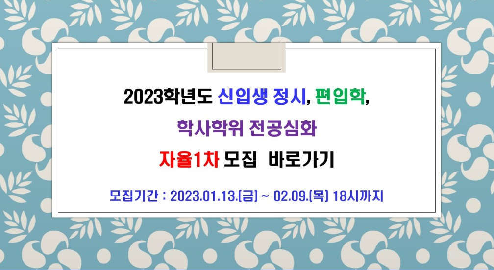 춘해보건대학교 치위생과 편입생 모집 전형이 진행중입니다. 모집 기간은 2023년 1월 13일 부터 2023년 2월 9일까지 진행되고 있어요. 일반편입은 2학년 1학기 개시가 7명, 3학년 1학기 개시가 5명으로 진행중에 있습니다.